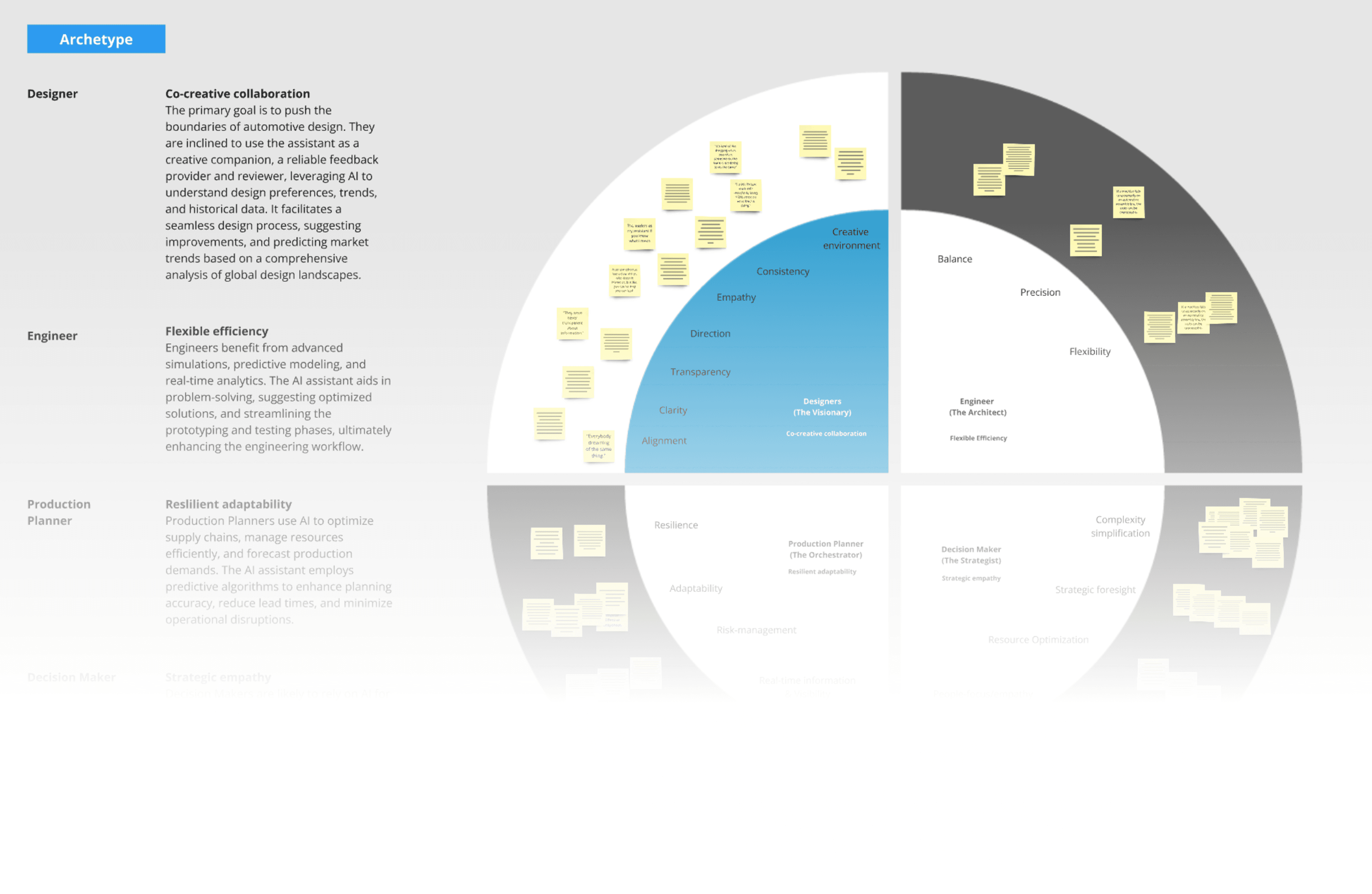 Through a rapid generative research study, I led the team to identify the needs of key stakeholders in the car production process. Our research informed crucial design decisions with Archetypes helping build personalized workspace environments and design principles and experience framework informing the design of interactive AI Assistant form, sound and voice personality.